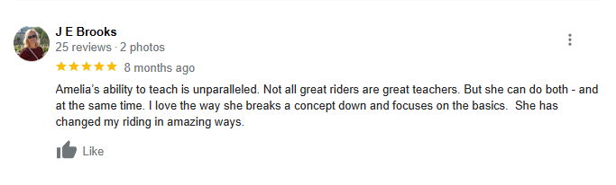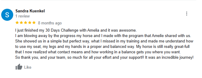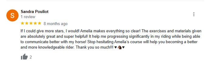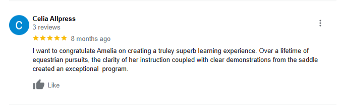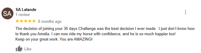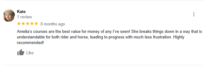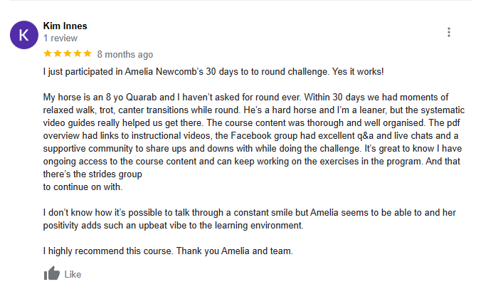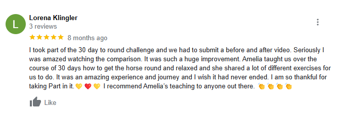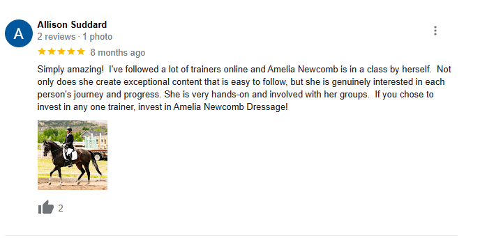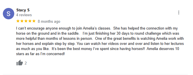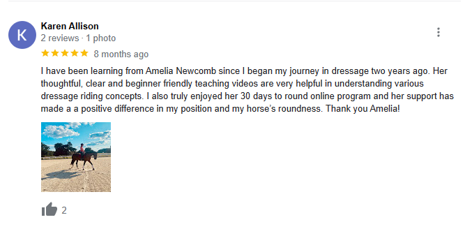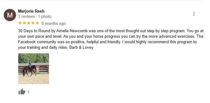 “Amelia’s online learning programs are amazing! I wish I had taken her 30 Days to Round class when my horse was 4… we have both learned so much. My last 4 lessons my trainer has complimented us and said she has never seen my horse so supple before. I would highly recommend this program for anyone who wants to improve their riding and their connection and relationship with their horse!”