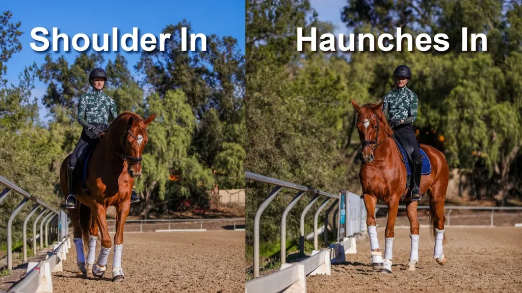 The haunches-in, or travers, is a four-track movement where the horse bends in the direction of travel, and the haunches move slightly inside the line of travel.