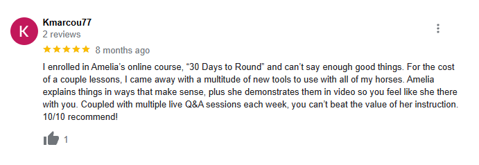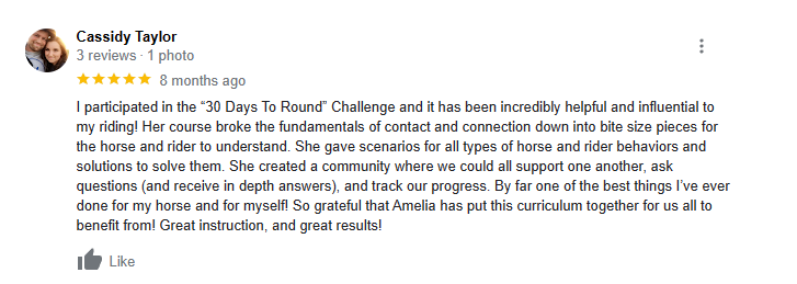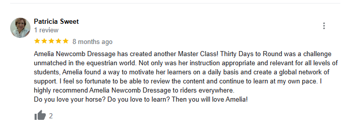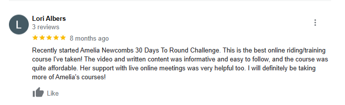I’m Amelia Newcomb and I’ve trained thousands of horses and riders. I’ve learned that if you break things down in a way that your horse can actually understand, your horse will become a willing partner and you will develop a relationship based on understanding and trust. When your horse is round they will relax and use their body correctly allowing you to control and maneuver them with ease ! This is exactly what I am going to teach you in the 30 Days to Round Challenge”