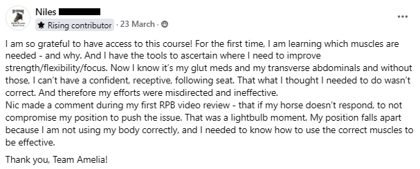 In addition, this is the most COMPREHENSIVE program that Amelia has ever designed for Rider Position. It includes hundreds of hours of content for both in and out of the saddle. Plus it includes 10 weeks of personalized feedback on your riding videos. Even if you have taken another course from Amelia, this one is a step above.